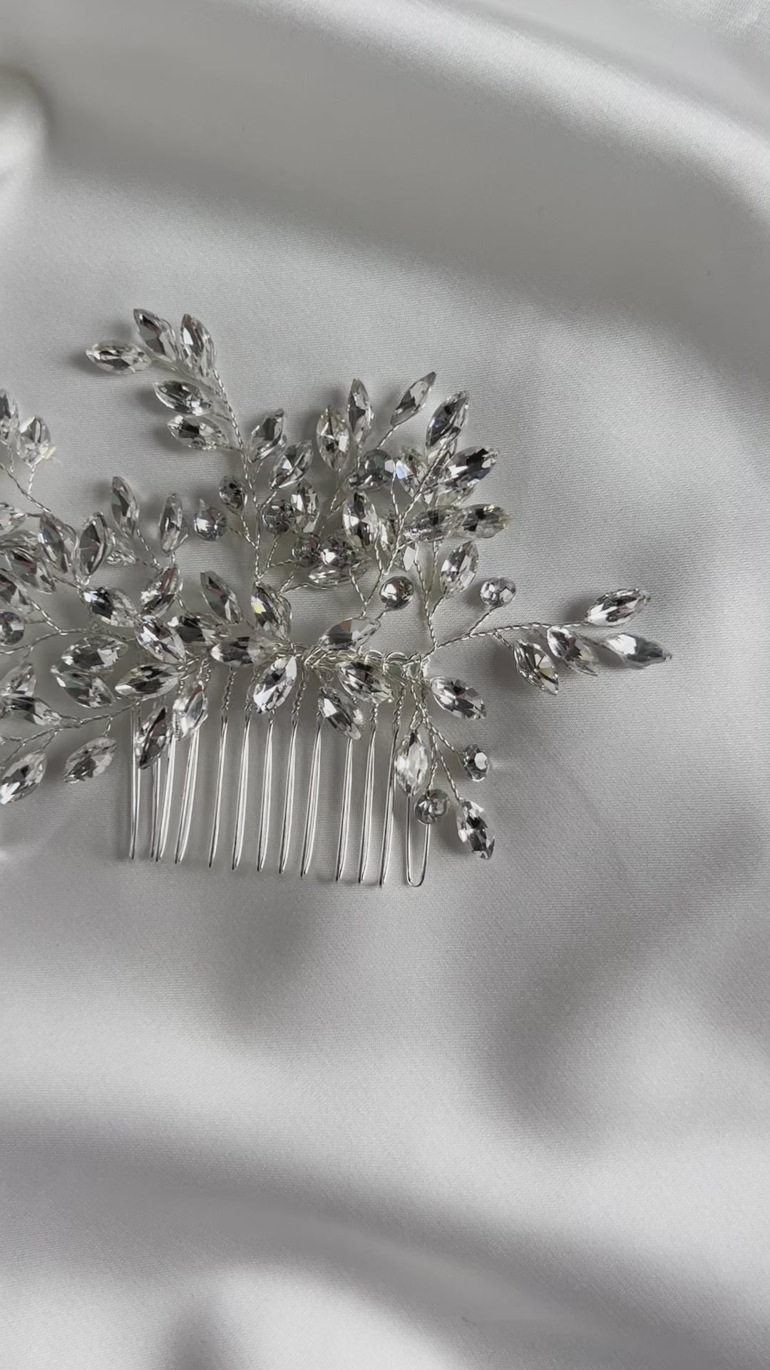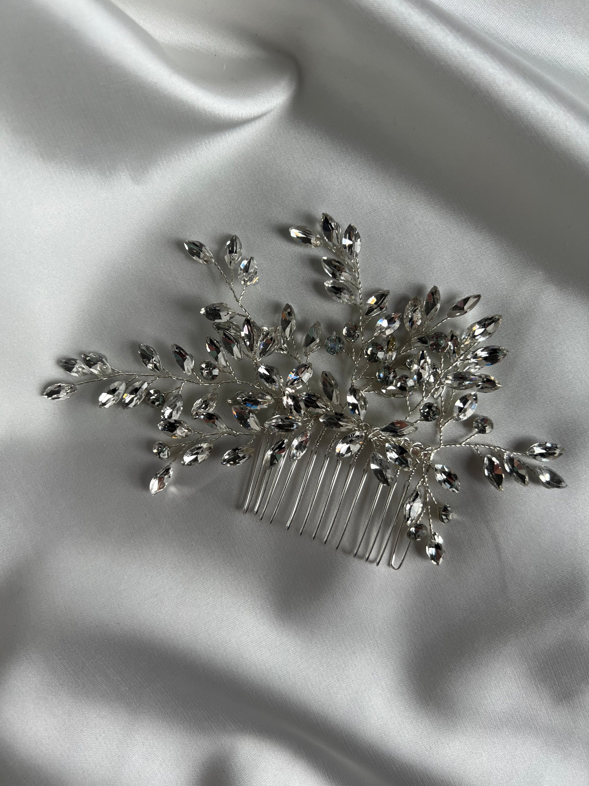 Whether you're opting for an updo or leaving your hair cascading, this hair comb effortlessly enhances any hairstyle, providing a sophisticated finishing touch. Embrace the ethereal beauty of diamantes with our handcrafted Bree hair comb, designed to make your wedding day truly unforgettable.
