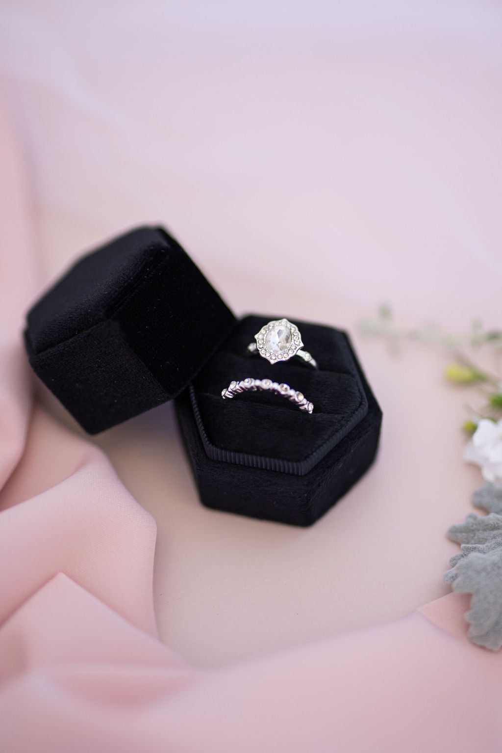 Each hexagon-shaped box features a plush velvet exterior that is pleasing to the touch and offers a touch of opulence. The interior is thoughtfully designed with single and double ring slots, ensuring your precious rings are securely nestled in place. These ring boxes are not only perfect for weddings but also make a wonderful gift for engagements, anniversaries, or any occasion that celebrates love. Elevate the presentation of your cherished rings and create unforgettable memories with our Velvet Hexagon Ring Boxes.