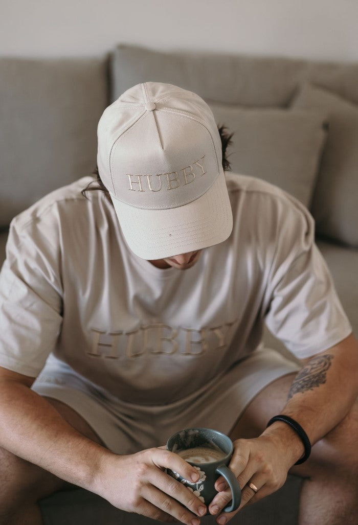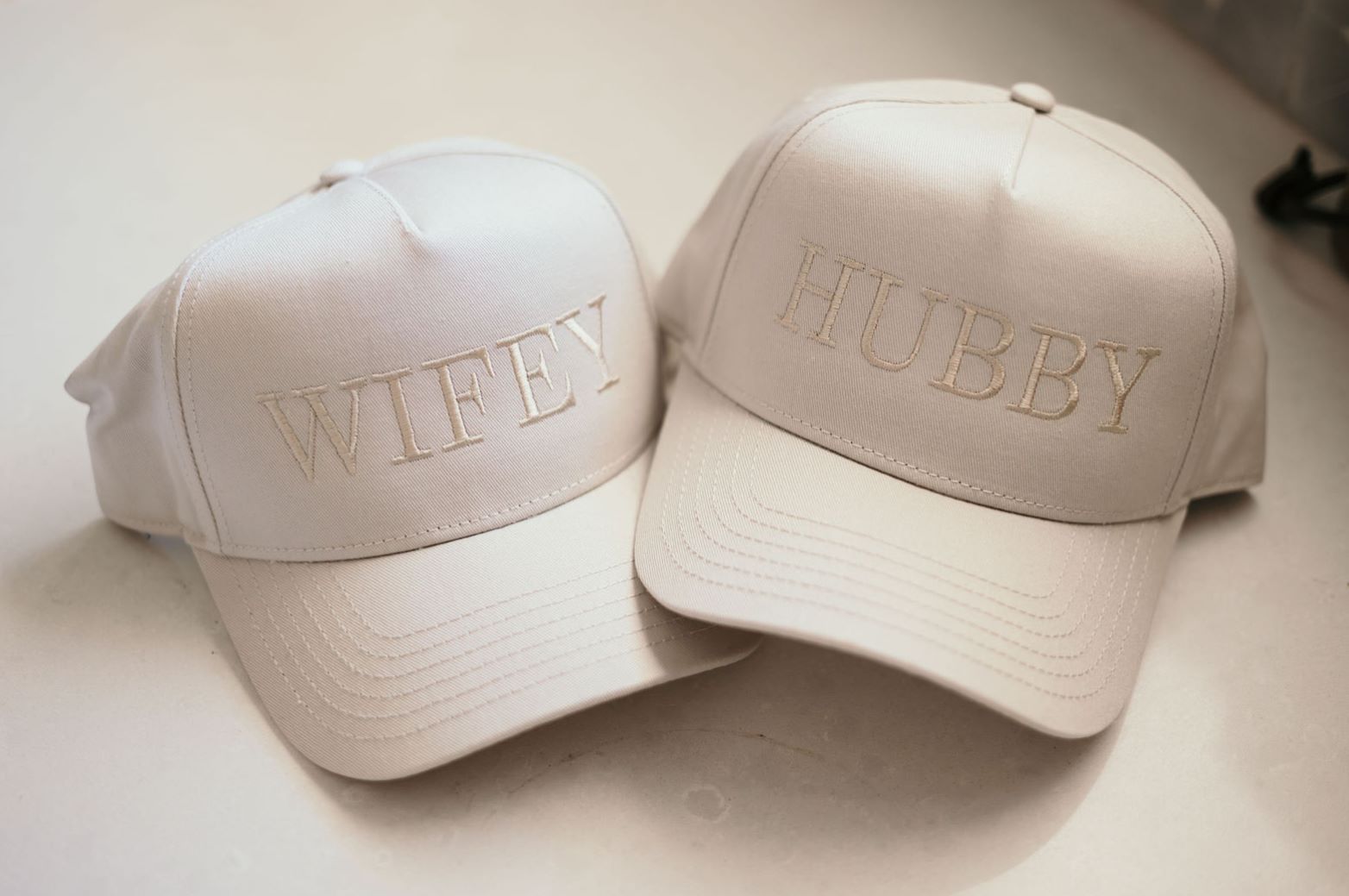 These high-quality hats with champagne embroidery are crafted from durable stone-colored fabric, providing a neutral yet chic look that complements our Hubby and Wifey loungewear outfits.