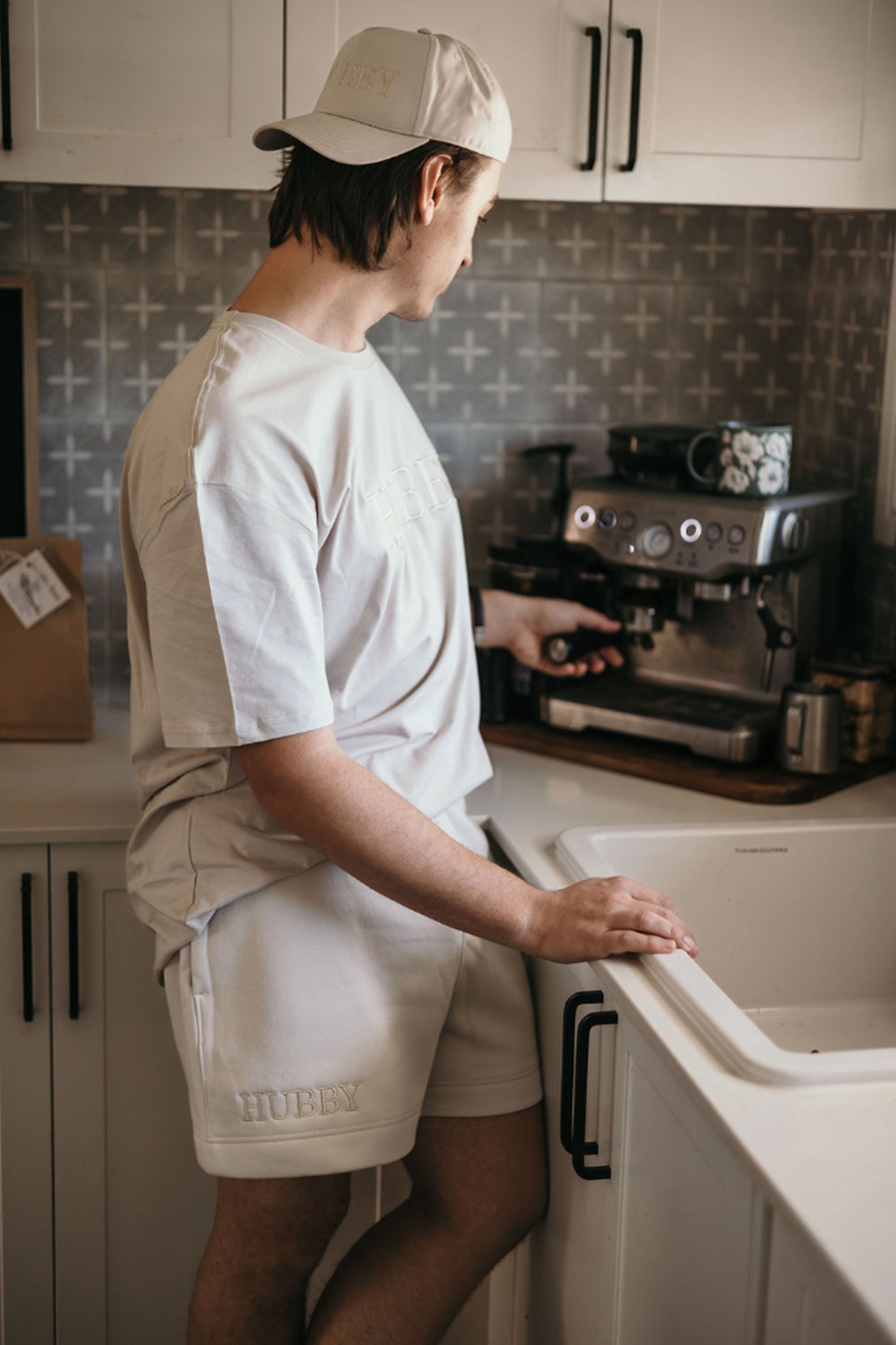 Sweat shorts, self-fabric elasticated waistband, tonal internal drawcord, 2 side pockets, single pocket at back, double needle hems